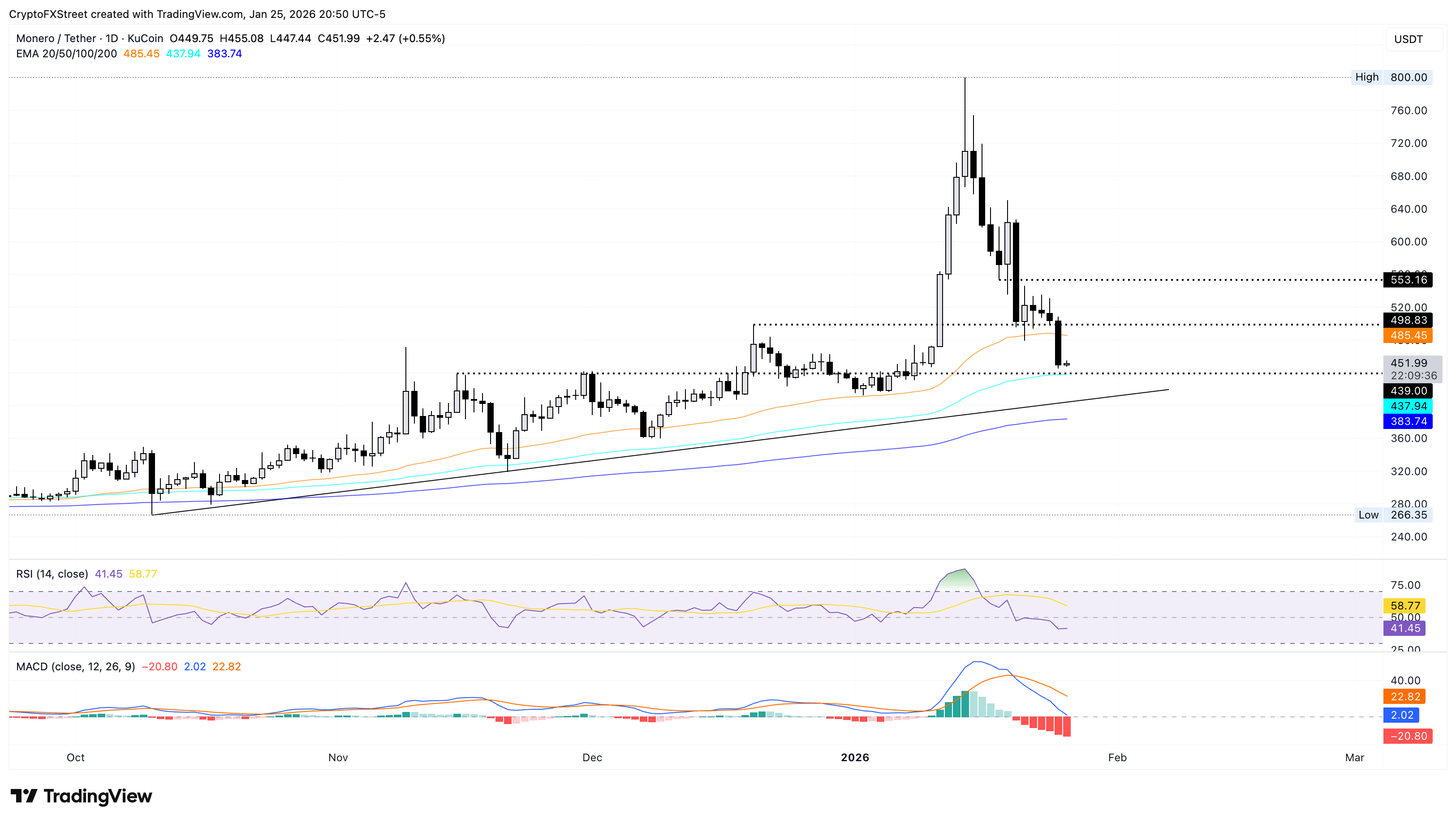 Monero cotiza por debajo de 500$ tras una caída del 21% la semana pasada, sugiriendo una demanda reducida para la moneda de privacidad. En el momento de escribir estas líneas, XMR se mantiene alrededor de 450$ el lunes, estabilizándose por encima de la EMA de 100 días en 437$, tras una caída del 10% el domingo. Mientras tanto, la EMA de 200 días en 383$ sigue siendo el piso de tendencia principal.