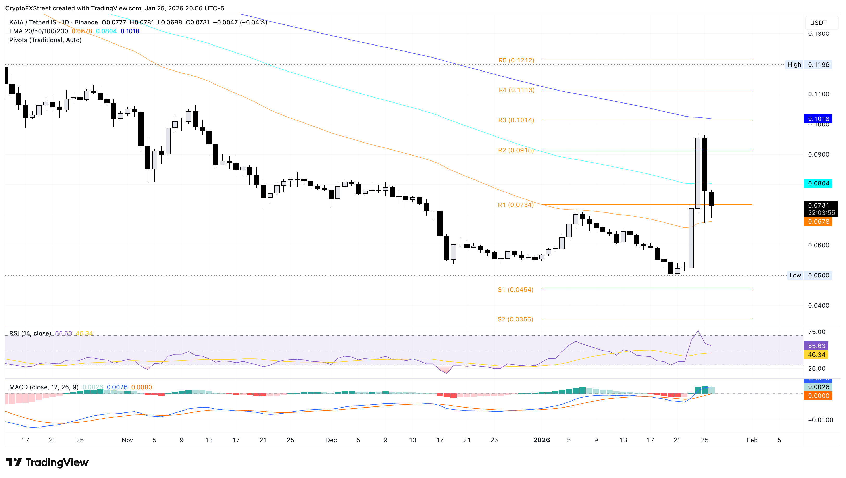 Kaia ha bajado un 6% en el momento de escribir estas líneas el lunes, extendiendo la caída del 18% del domingo. El retroceso en KAIA arriesga borrar las ganancias del 32% del sábado con un cierre por debajo del Punto Pivote R1 en 0.0735$.