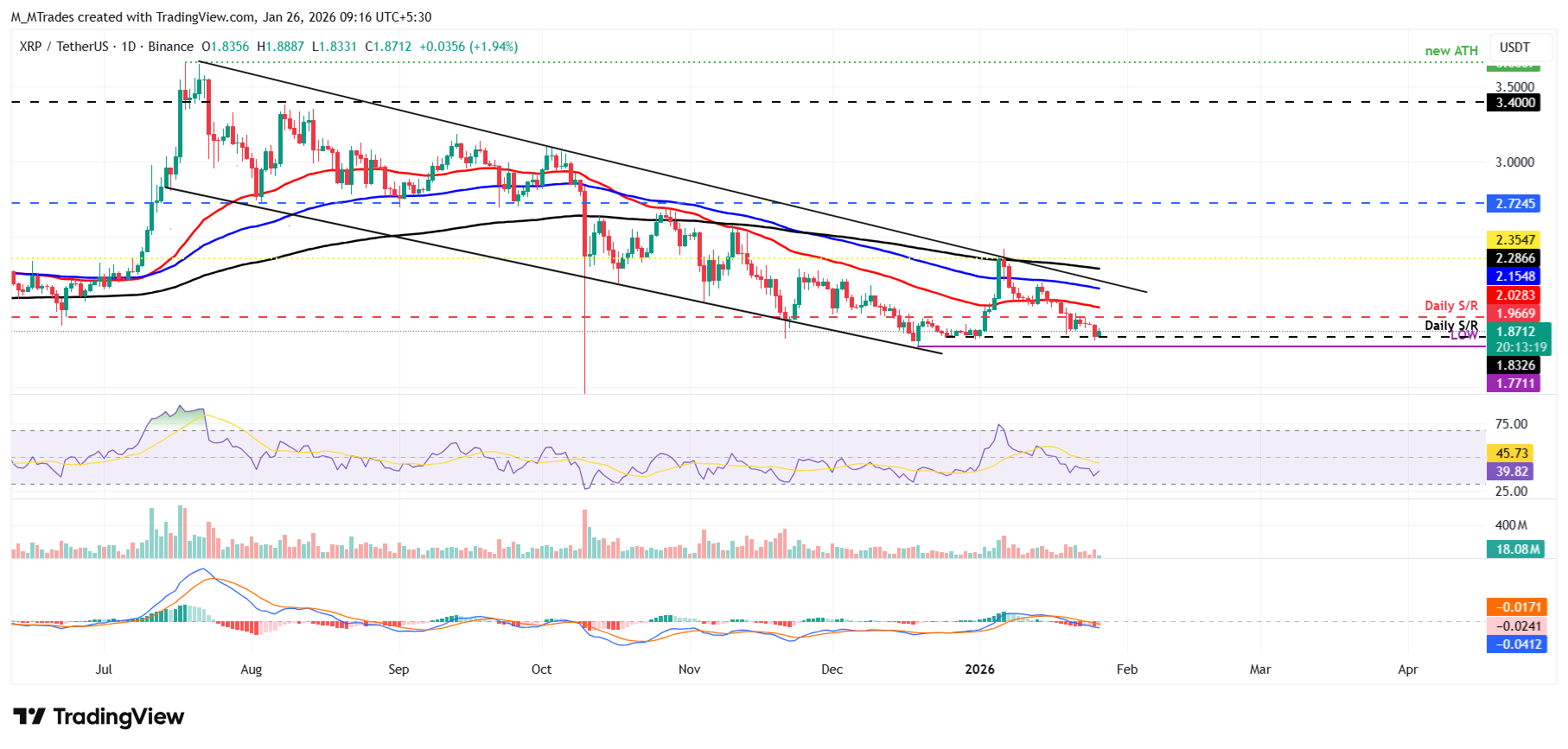 Por el contrario, si XRP cierra por debajo del soporte diario en 1.83 $, podría extender la caída hacia el mínimo del 19 de diciembre de 1.77 $.