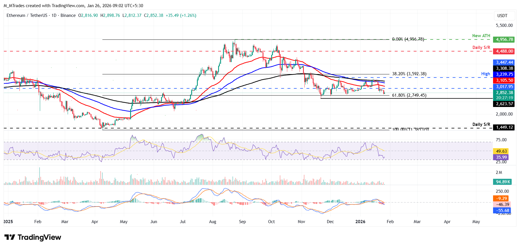 Si el nivel de retroceso de Fibonacci del 61.8% en 2.749 $ se mantiene, ETH podría recuperarse hacia el nivel de resistencia diario en 3.017 $.