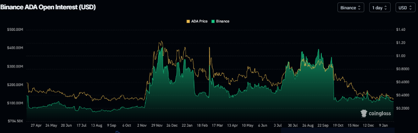 El Interés Abierto (OI) de futuros de Cardano en el intercambio Binance cayó a 108.55 millones de dólares el domingo, el nivel más bajo desde el 25 de diciembre, según datos de Coinglass. Esta caída en el OI refleja una disminución en la participación de los inversores y proyecta una perspectiva bajista.