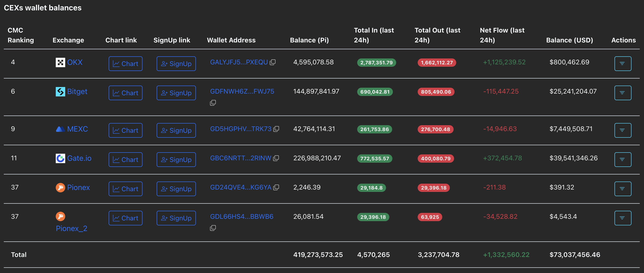 Los datos de PiScan muestran un aumento constante en los depósitos realizados en CEX, totalizando 1.33 millones de tokens PI en las últimas 24 horas. El intercambio OKX registró 1.12 millones en entradas, el mayor entre los intercambios registrados bajo Know-Your-Business (KYB) que apoyan el token Pi.