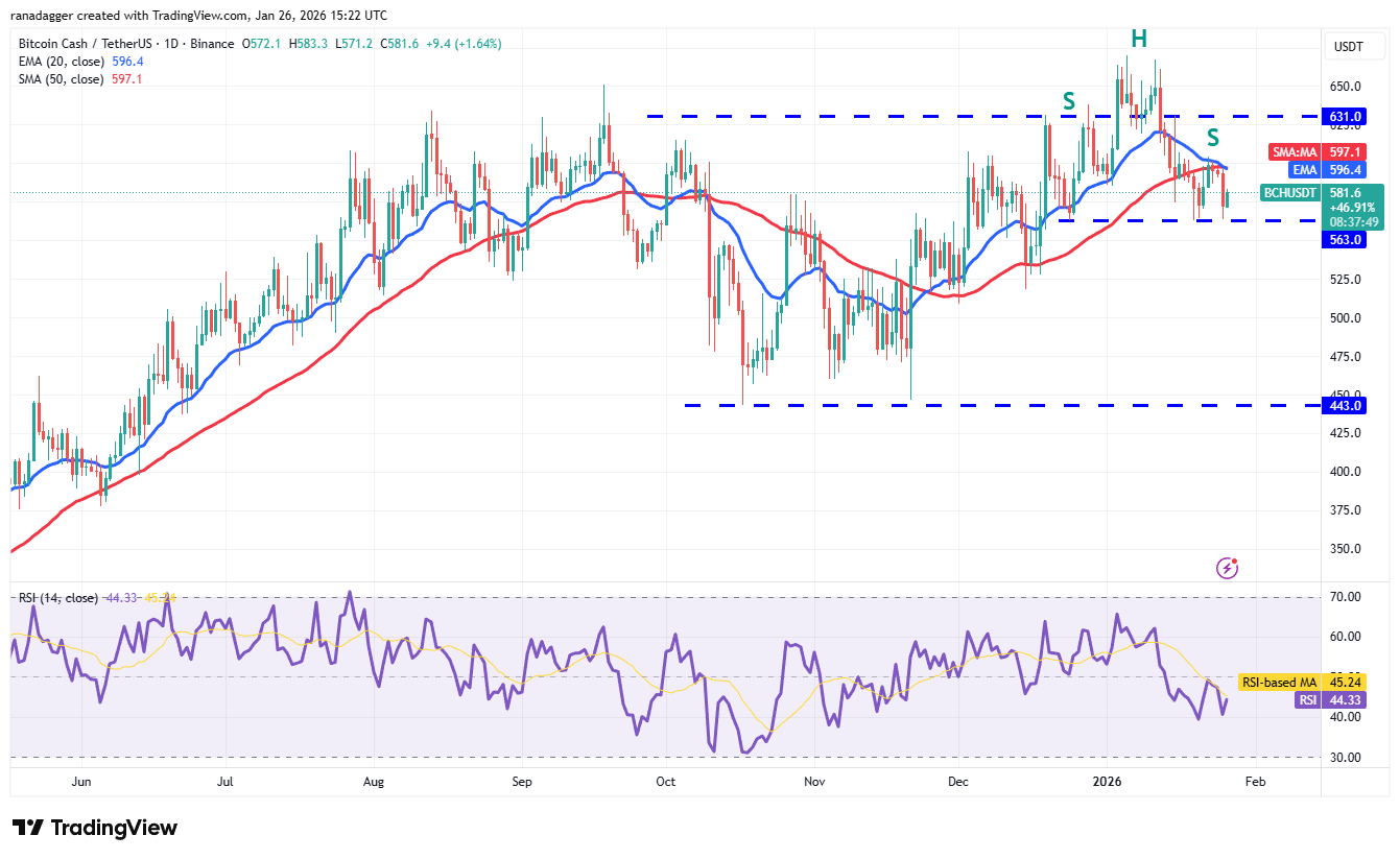Bitcoin Cash (BCH) retrocedió bruscamente desde la EMA de 20 días (596 dólares) el domingo, pero un punto positivo menor es que los alcistas mantuvieron el nivel de 563 dólares.
