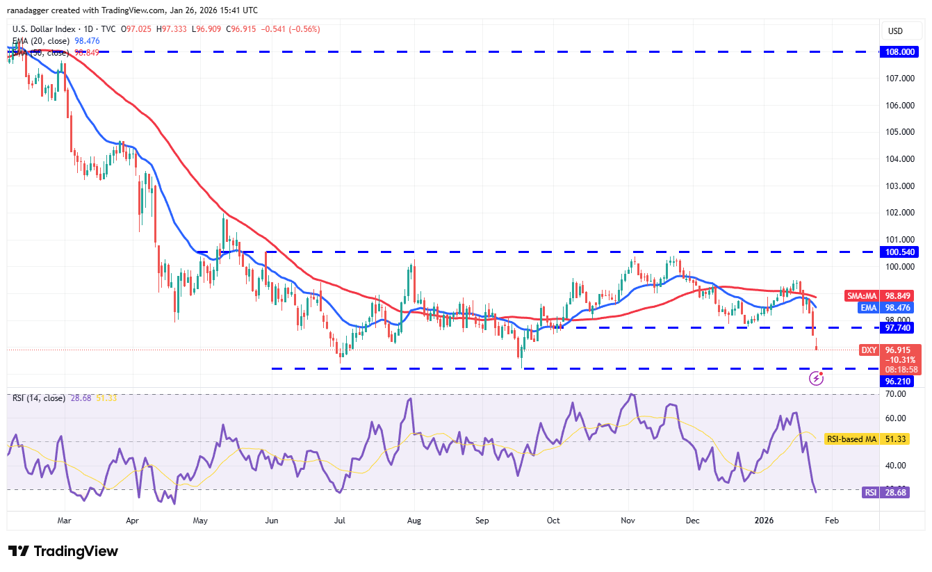 Los vendedores intentarán arrastrar el precio al soporte sólido de 96,21, que es un nivel crítico a tener en cuenta. Si el soporte cede, el índice podría reanudar la tendencia bajista hacia el nivel de 94,62.