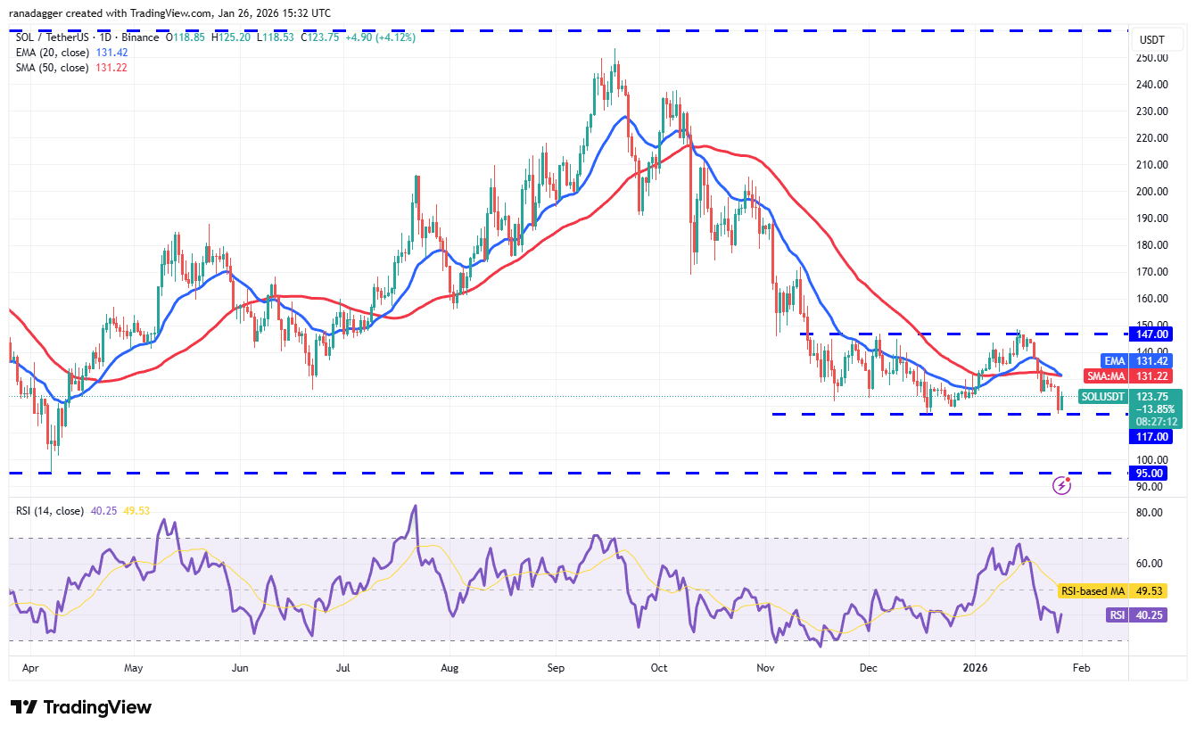 Solana (SOL) rebotó en el soporte de 117 dólares el lunes, lo que indica que los alcistas están defendiendo el nivel.