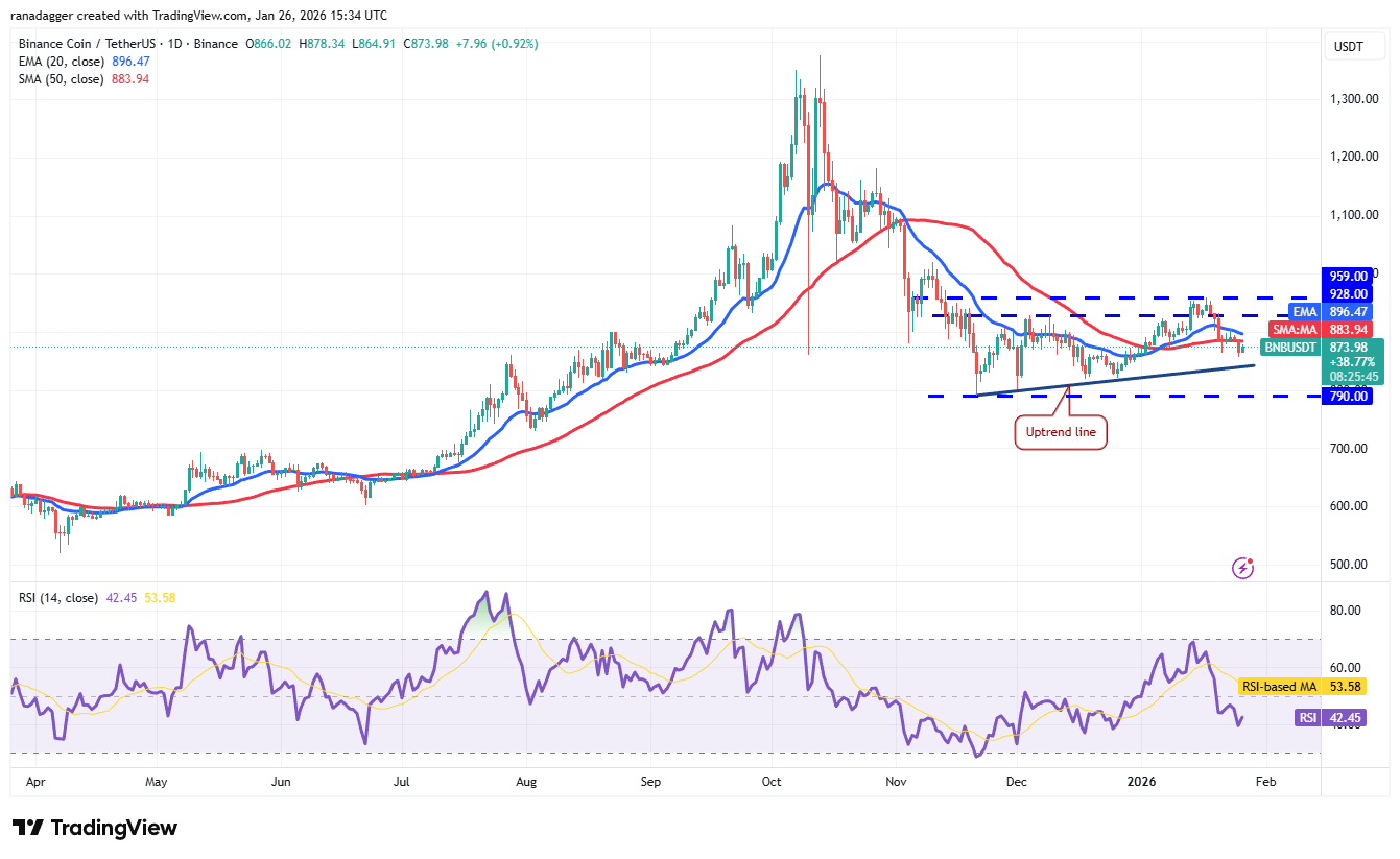 BNB (BNB) cerró por debajo de la SMA de 50 días (883 dólares) el domingo, lo que indica que los alcistas están perdiendo el control.