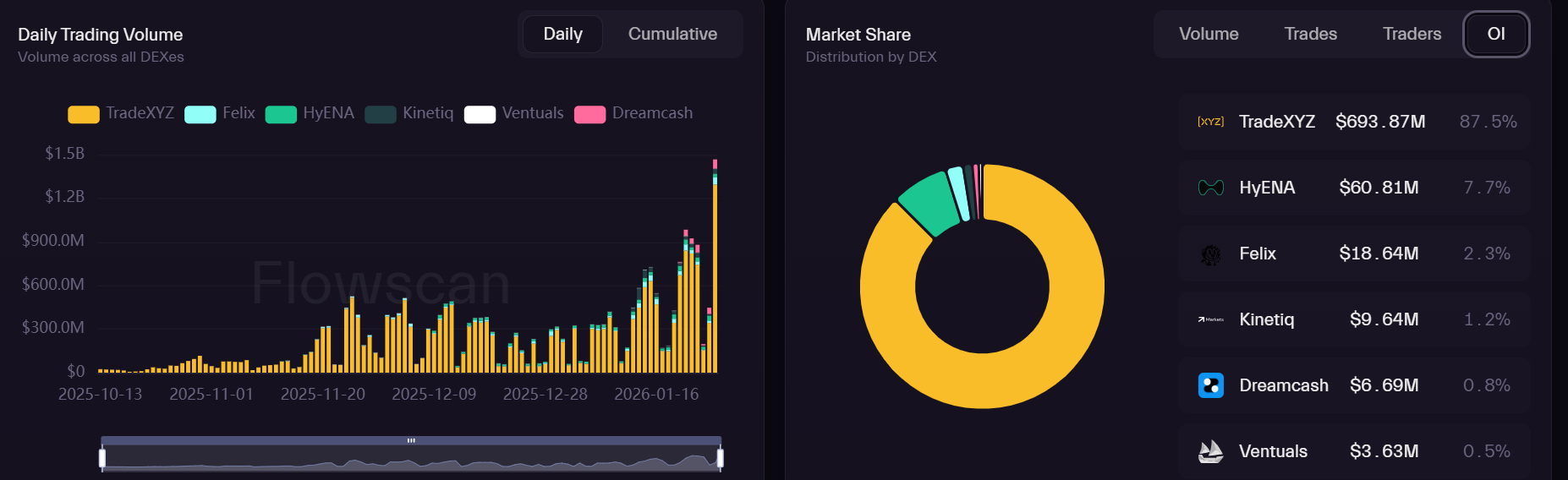 La mayor parte del crecimiento en el interés abierto y el volumen de comercio en HIP-3 proviene de la plataforma TradeXYZ, que permite el comercio de commodities y acciones. Según los datos de Flowscan, la plataforma registró un volumen de comercio diario de 1.290 millones $ en las últimas 24 horas, con un interés abierto de 693.8 millones $ en el momento de la publicación.