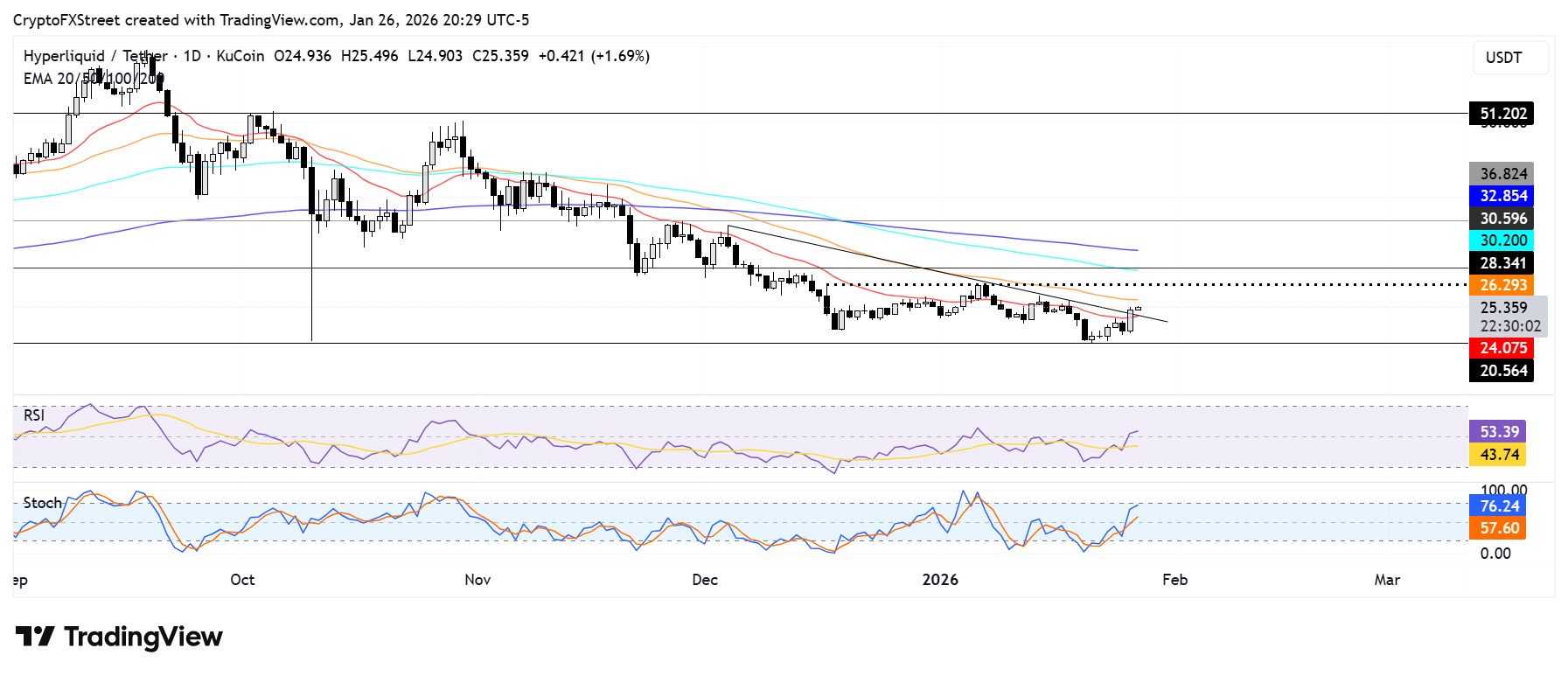 HYPE podría probar la resistencia en 28 $ si supera la EMA de 50 días. Sin embargo, un rechazo podría llevarlo a encontrar soporte cerca de la EMA de 20 días.