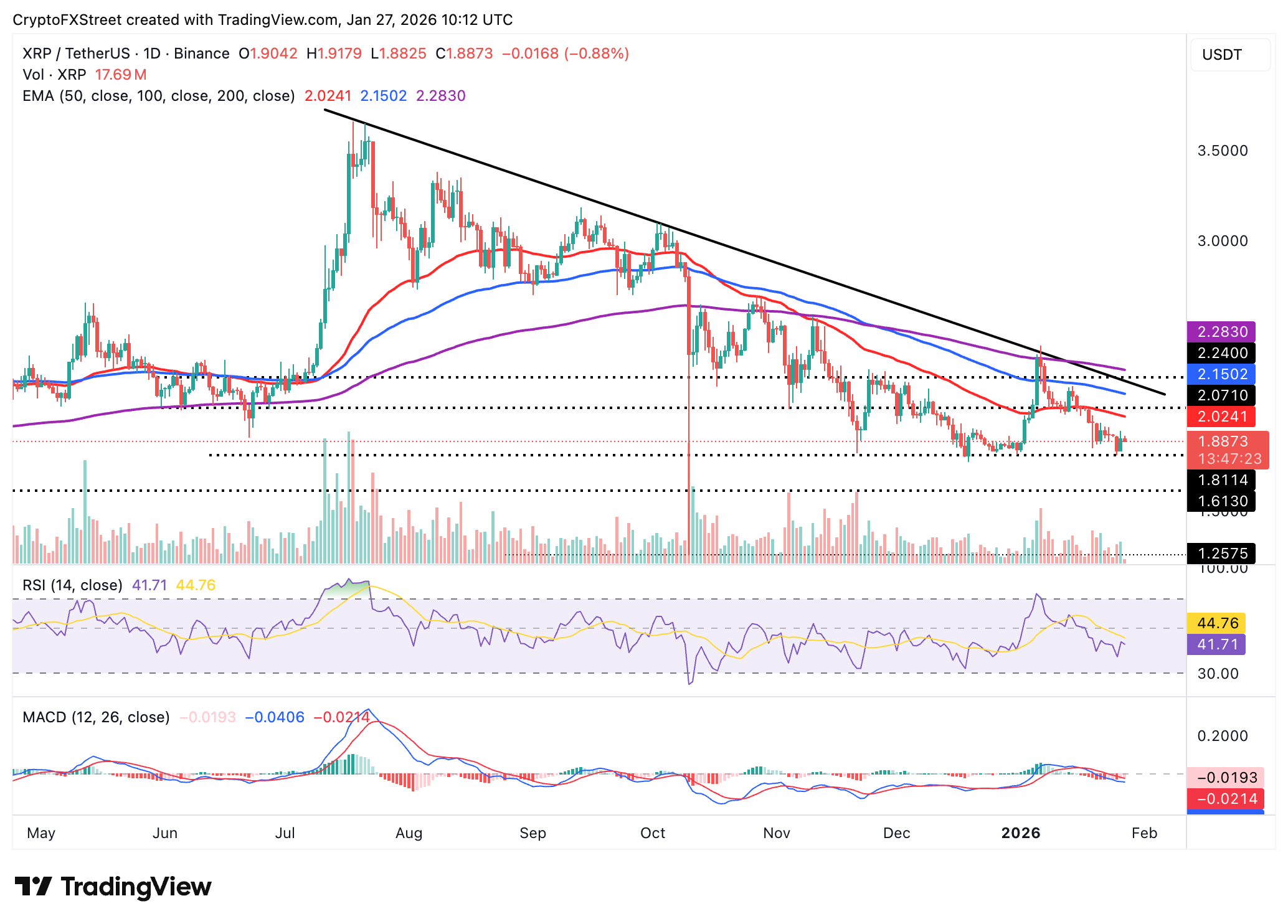 Ripple ($XRP) se está negociando alrededor de 1.88$ en el momento de escribir este artículo el martes, corrigiendo desde el máximo del día anterior de 1.95$. El token de remesas transfronterizas sigue bajo una inmensa presión en medio de una débil estructura técnica.