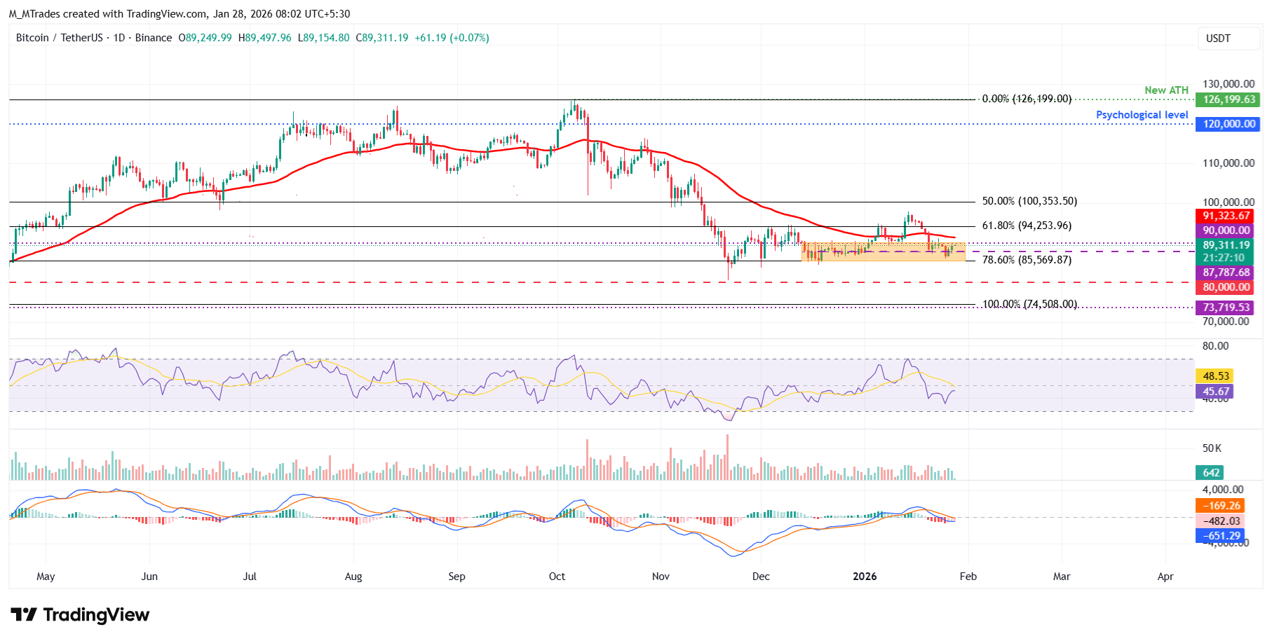 El precio del Bitcoin se recuperó ligeramente, cerrando por encima del punto medio de un canal paralelo horizontal en 87.787 $ el lunes, tras una corrección del 7.48% la semana pasada. $BTC continuó su recuperación el martes, encontrando soporte alrededor del nivel medio. Al momento de escribir el miércoles, $BTC se está negociando a 89.300 $.