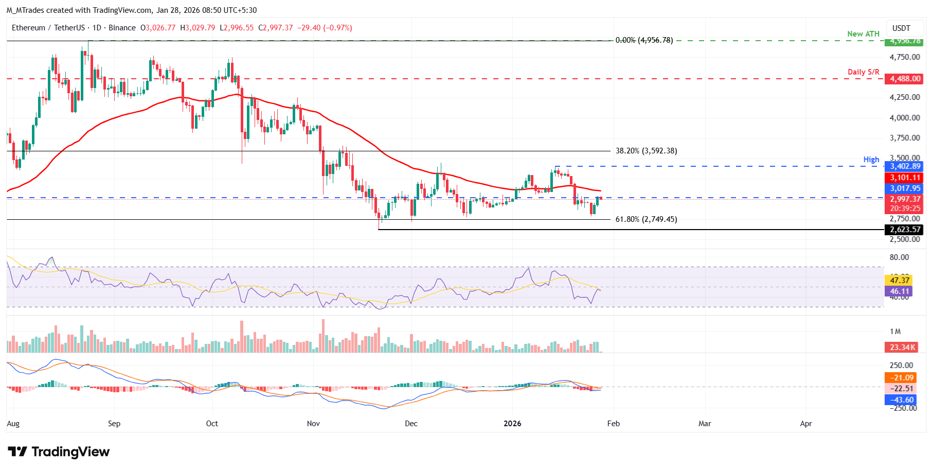 Si $ETH rompe por encima de la resistencia diaria en 3.017 $ y cierra por encima de la media móvil exponencial (EMA) de 50 días en 3.101 $ de manera diaria, podría extender el rally hacia el máximo del 14 de enero en 3.402 $.