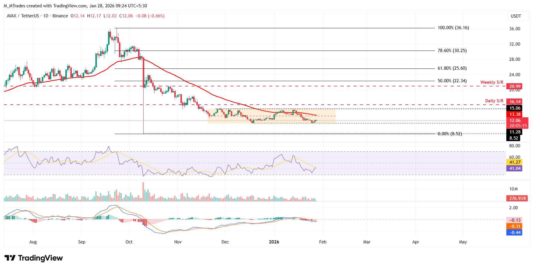 Por otro lado, si $AVAX enfrenta una corrección, podría extender la caída hacia el límite inferior del patrón de canal horizontal en 11.28$.