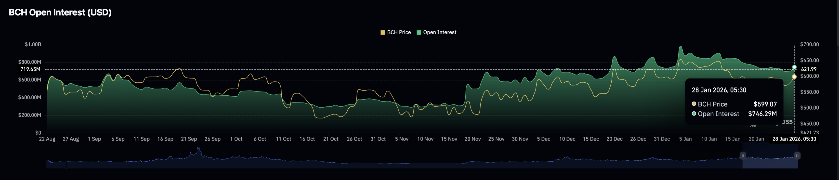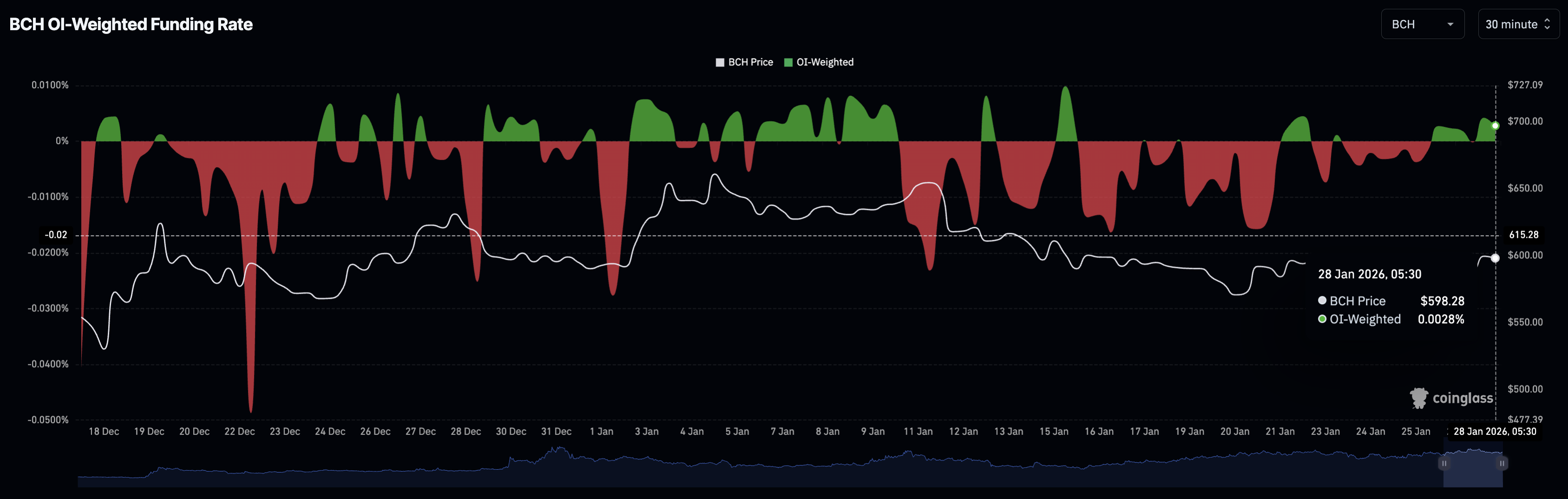 Bitcoin Cash está presenciando signos tempranos de participación minorista, alineándose con la recuperación observada hasta ahora esta semana. Típicamente, una alineación de tasas de financiamiento positivas y un aumento en el interés abierto (OI) señala un mayor potencial alcista para un activo. Los datos de CoinGlass muestran un aumento en el interés abierto de futuros de $BCH (OI) a 746.29 millones de dólares, desde 700.06 millones de dólares el martes, indicando una mayor exposición al riesgo a medida que los inversores anticipan más ganancias.