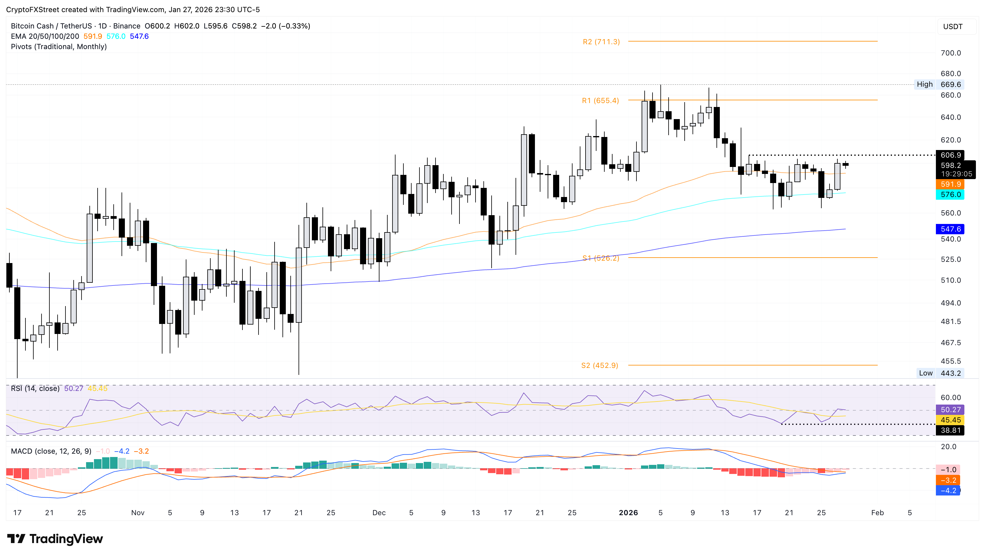 Un cierre decisivo por encima de este nivel podría extender el rally de $BCH hacia el Punto de Pivot R1 en 655$, que anteriormente limitó las ganancias a principios de enero.