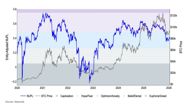 Desde el punto de vista on-chain, los indicadores de sentimiento muestran un enfriamiento claro. El Net Unrealized Profit/Loss (NUPL) ajustado por entidad cayó desde la zona de “Belief” hacia “Anxiety” tras el sell-off de octubre, y desde entonces no ha logrado una recuperación sostenida.