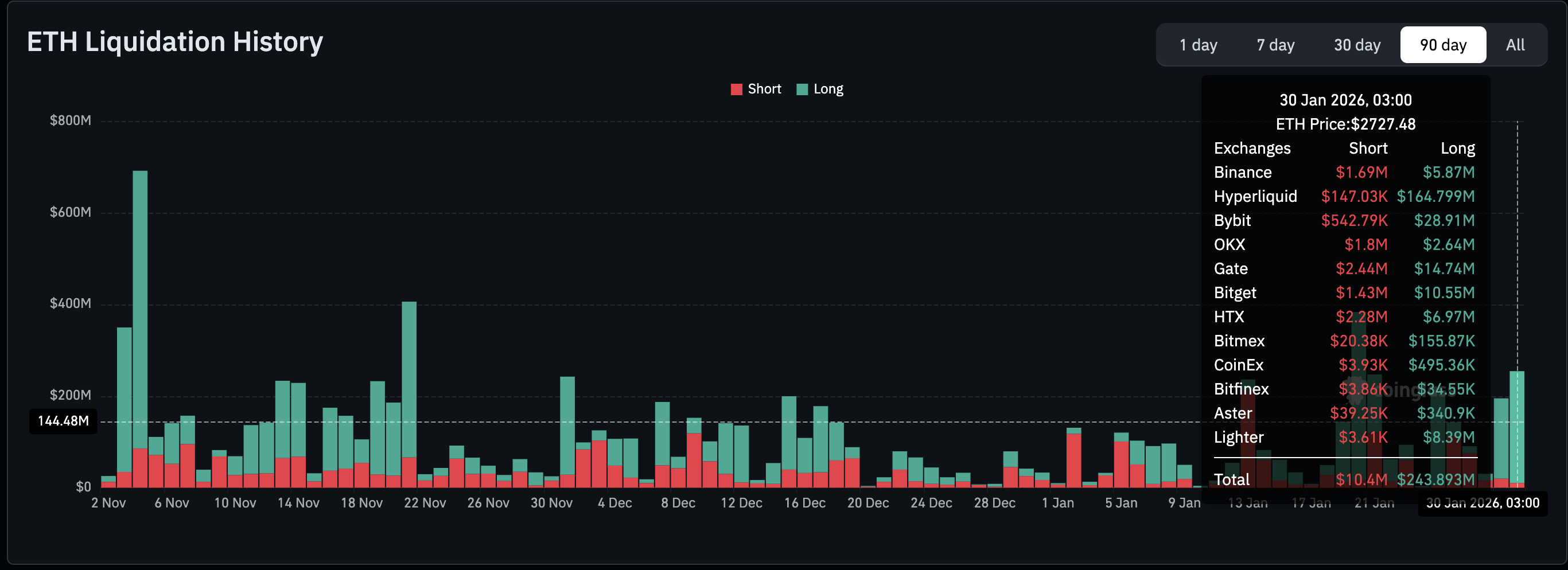 Mientras tanto, Ethereum enfrenta ventas agresivas a medida que el precio extiende la caída por debajo de la marca de 3.000$ y se mantiene por encima de 2.700$ en el momento de escribir. Los datos de CoinGlass muestran liquidaciones largas de aproximadamente 244 millones de dólares el viernes y 175 millones de dólares el jueves.