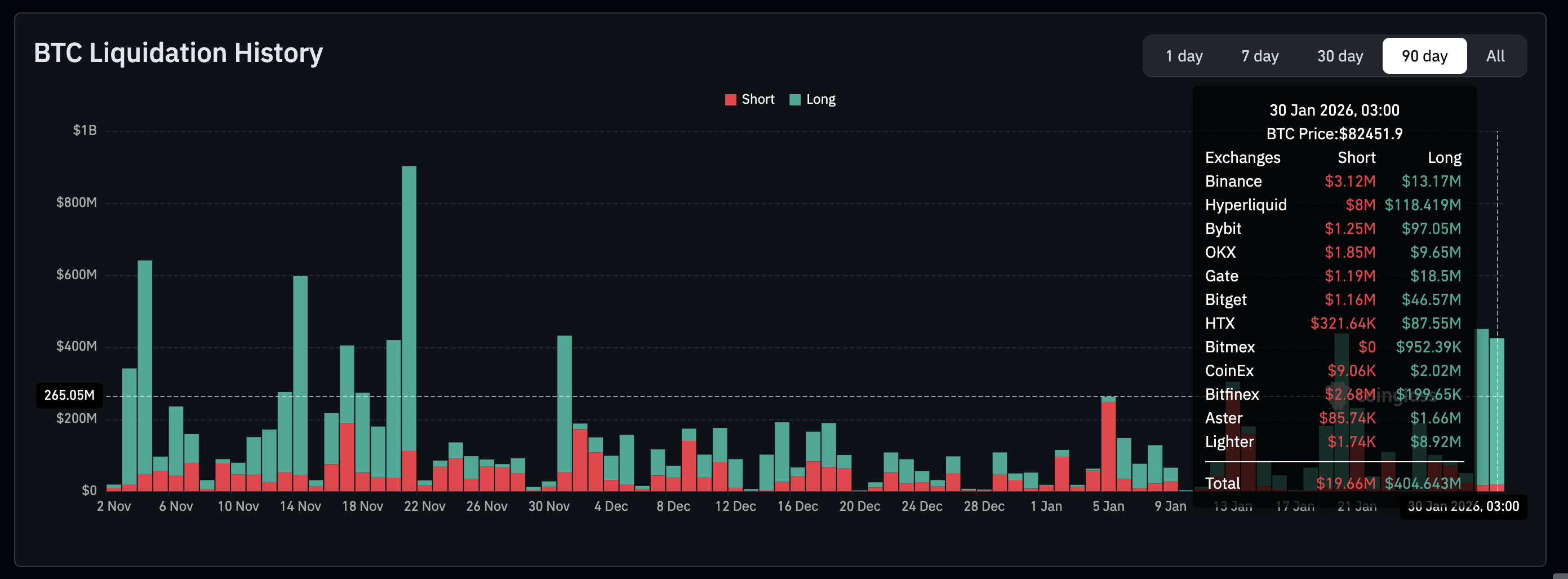 Los vientos en contra desencadenaron liquidaciones masivas de posiciones largas, con operadores apalancados perdiendo más de 405 millones de dólares el viernes y aproximadamente 433 millones de dólares el jueves. Con el sentimiento de aversión al riesgo aún persistente, Bitcoin corre el riesgo de extender su corrección por debajo del soporte psicológico de 80.000$.
