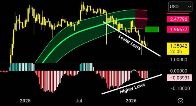 “$XRP. Divergencia alcista del MACD de 5 días. Extensión del precio desde el Canal Gaussiano. Si se desarrolla el rally de marzo/abril, es muy probable un retesteo del GC inferior ($1.96)”, señaló ChartNerdTA.