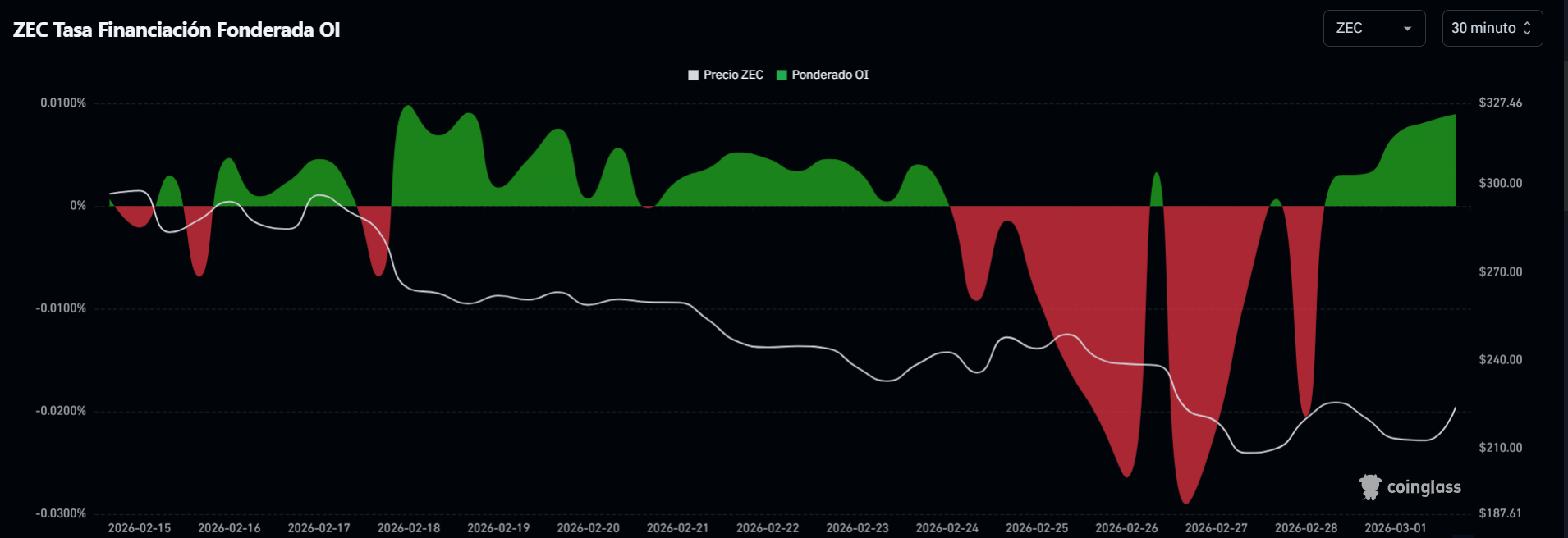 El gráfico de funding rates de Zcash ($ZEC) refleja un cambio claro en el sentimiento del mercado durante los últimos días. Entre el 24 y el 28 de febrero, las tasas de financiación permanecieron en terreno negativo, llegando a caer cerca del -0,0300%, mientras el precio descendía progresivamente desde la zona de los $240–$250 hasta niveles cercanos a los $210, evidenciando un dominio de posiciones cortas y una fuerte presión bajista en el mercado de derivados.