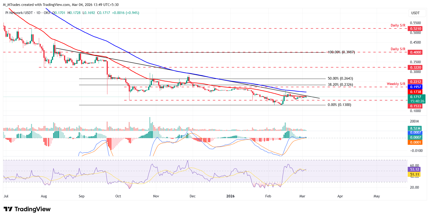 El precio de Pi Network encontró soporte alrededor del nivel de soporte diario en 0.153 $ el 23 de febrero y subió más del 7% en los siguientes cuatro días, volviendo a probar la media móvil exponencial (EMA) de 50 días en 0.173 $. PI ha estado enfrentando rechazo alrededor de la EMA desde el sábado, y a partir del miércoles, se está acercando a este nivel de resistencia. Esta EMA de 50 días coincide aproximadamente con la línea de tendencia descendente (dibujada conectando múltiples máximos desde mediados de agosto), lo que la convierte en una zona clave a observar.