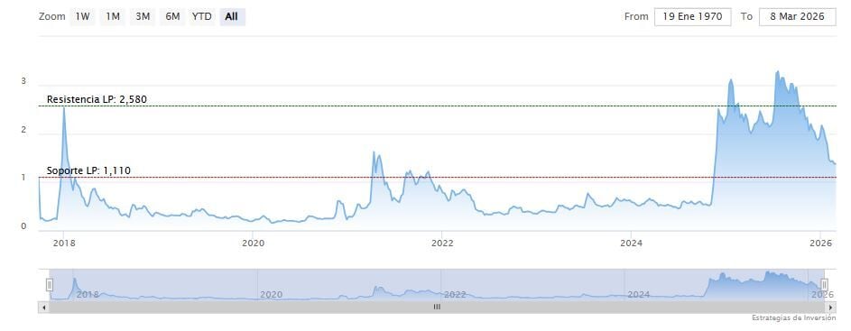 La cifra destaca la magnitud de la reciente caída del activo, ya que cotiza cerca de los 1.34 dólares, una caída de más del 63% desde su máximo histórico de 3.65 dólares alcanzado en julio de 2025.