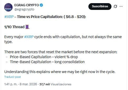 Sin embargo, los comentarios del mercado sobre $XRP reflejan opiniones encontradas sobre el próximo movimiento. EGRAG Crypto, un inversor alcista permanente en $XRP, escribe que los ciclos del activo suelen incluir caídas de precios y largos períodos de consolidación antes de que comience una nueva fase de expansión. En el mismo hilo, el analista sugirió que la estructura actual podría representar un período de "capitulación basada en el tiempo", donde el sentimiento se restablece durante las operaciones laterales largas.