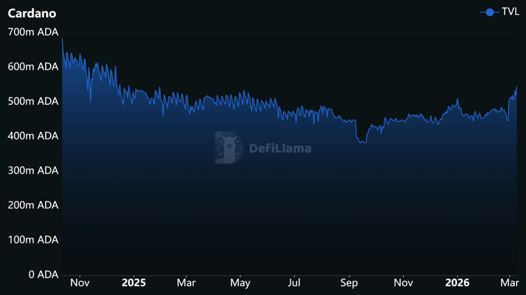 Los datos de DeFiLlama muestran que el TVL de Cardano ha aumentado a 545 millones de $ADA, su nivel más alto desde finales de enero de 2025. Este aumento suele indicar que más usuarios están bloqueando tokens $ADA en la blockchain para gestionar transacciones. Por lo tanto, este aumento podría reducir la oferta de $ADA en los exchanges y provocar un aumento de precio si la demanda también aumenta.