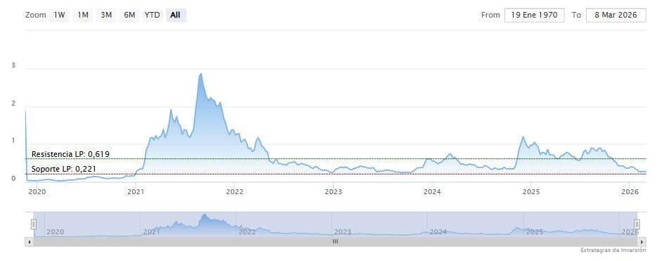 El soporte a mediano y largo plazo se encuentra en los 0.22 dólares. Mientras, los indicadores de Ei se muestran mixtos.