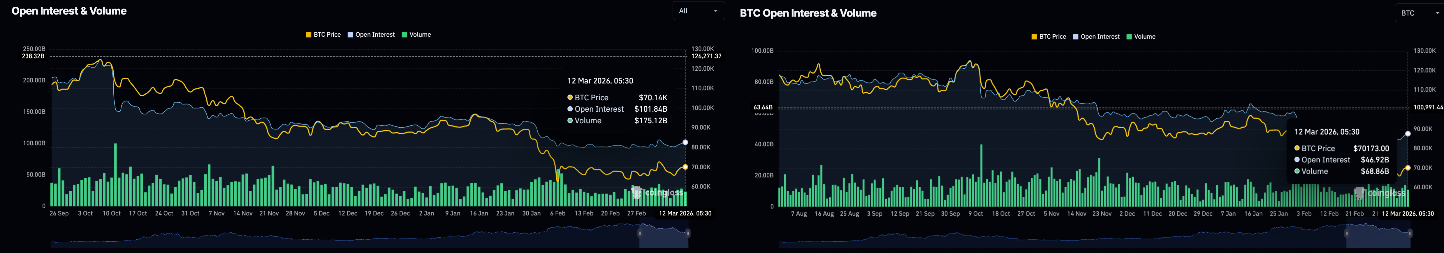 En el lado de los derivados, el interés abierto (OI) del mercado de criptomonedas más amplio se sitúa en 101.84 mil millones de dólares, un aumento desde los 99.88 mil millones de dólares del miércoles, respaldado por un volumen de comercio de 175.12 mil millones de dólares. Mientras tanto, el OI de futuros de Bitcoin aumentó a 46.92 mil millones de dólares, desde los 46.06 mil millones de dólares del día anterior.