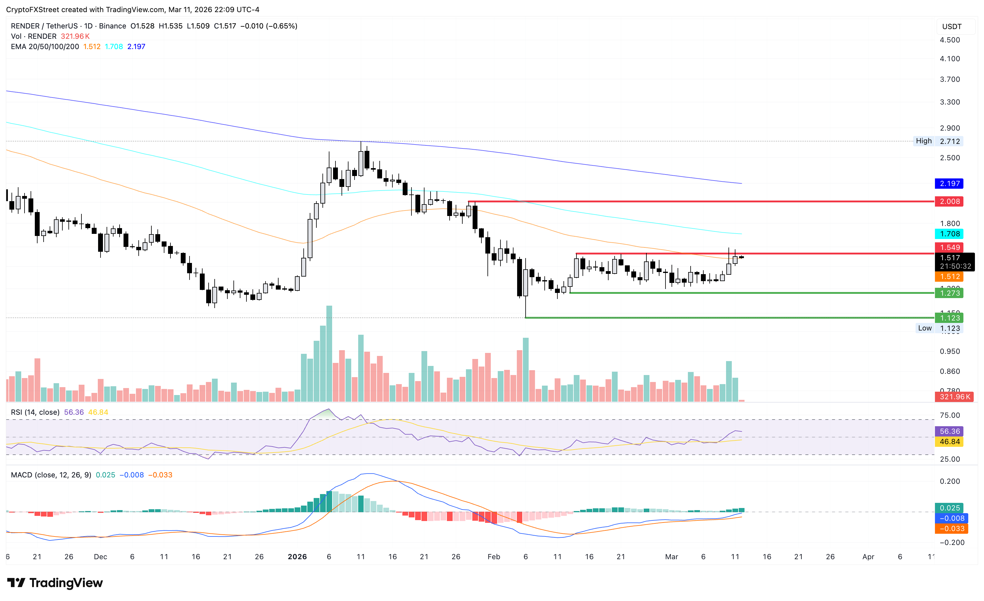 Mientras tanto, la recuperación a mitad de semana de Render enfrenta una resistencia clave cerca de su EMA de 50 días en 1.51$. Un cierre diario por encima de esta área expondría el siguiente obstáculo al alza en la región de 1.60$ antes de una oferta más fuerte cerca de la banda de 1.70$ alineada con la EMA de 100 días.