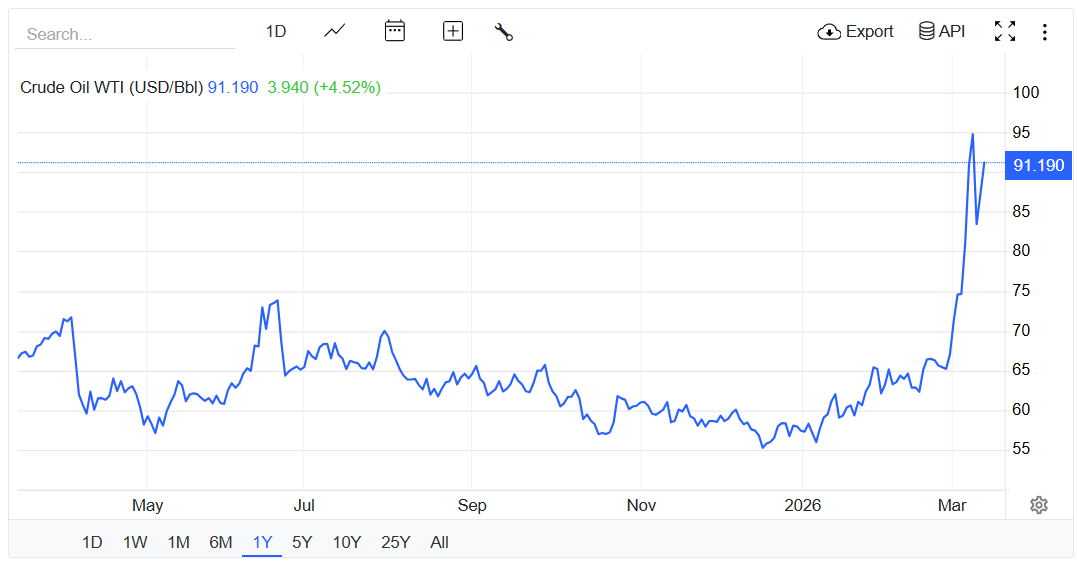 El precio del petróleo crudo subió brevemente a 95 dólares por barril el jueves, mientras el conflicto entraba en su 13.er día, según datos de Trading Economics.