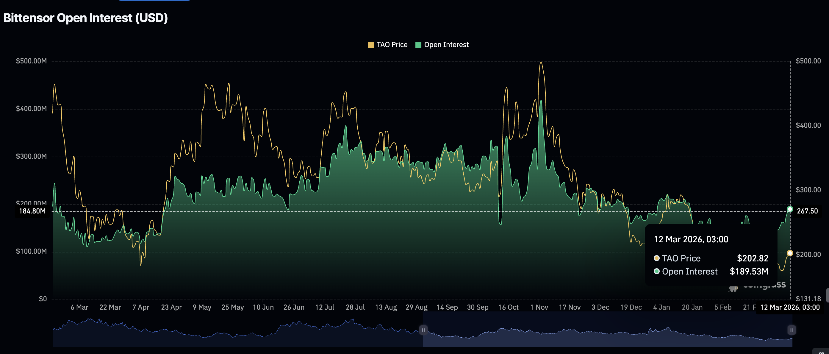 El interés minorista en Bittensor se ha estabilizado esta semana, con el interés abierto de futuros (OI) expandiéndose a 190 millones de dólares el jueves, desde 186 millones de dólares el día anterior. Mirando hacia atrás, el OI promedió 160 millones de dólares el lunes, subrayando la importancia de la demanda minorista para mantener el impulso.