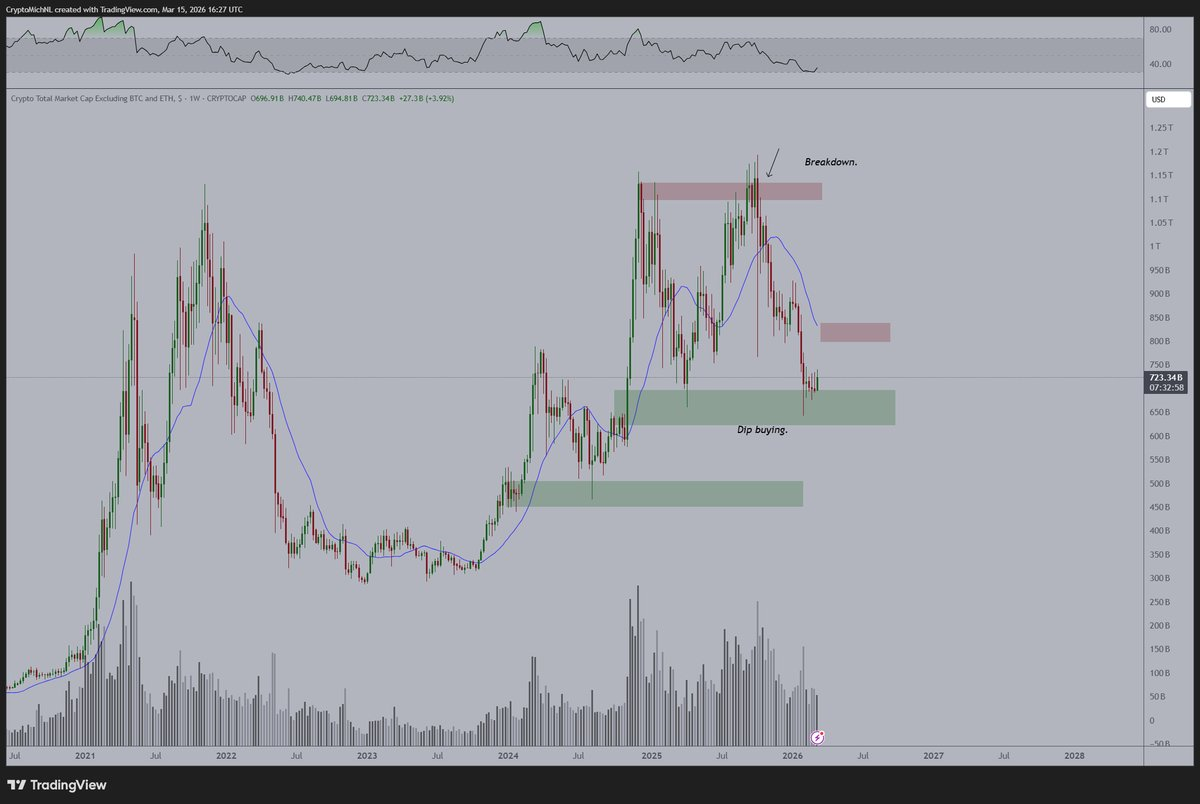 Van de Poppe acompaña su escrito con la siguiente imagen en la que se ve la capitalización total del mercado de criptomonedas excluyendo a bitcoin y ether (ETH):