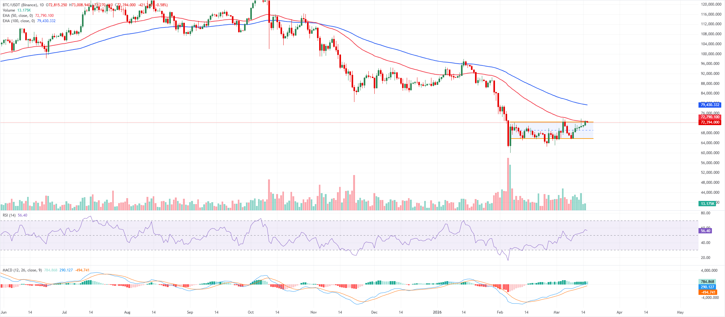 El precio del Bitcoin está cotizando a 72.300$ el lunes. La tendencia a corto plazo es ligeramente alcista ya que el precio presiona contra el límite superior del canal paralelo que ha enmarcado máximos más bajos desde principios de febrero. Los cierres diarios permanecen muy por debajo de las EMAs exponenciales de 50 y 100 días, que aún rondan los 70.000 y 80.000, actuando como una resistencia dinámica más amplia.