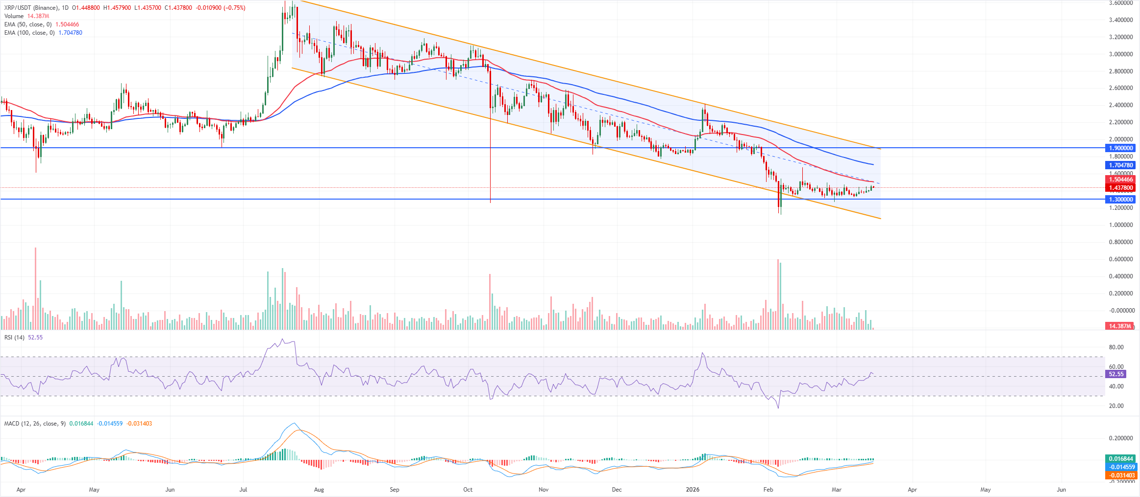 $XRP se mantiene por encima del reciente grupo de 1.35–1.36 mientras los cierres diarios avanzan, y el RSI en el gráfico diario en 52 señala un impulso en mejora tras superar la línea de 50. El indicador MACD está por encima de su línea de señal en territorio positivo, con un histograma que se expande modestamente, sugiriendo una presión alcista en fortalecimiento a medida que los vendedores pierden control, aunque el precio aún cotiza muy por debajo de las EMAs de 50 y 100 días en declive.