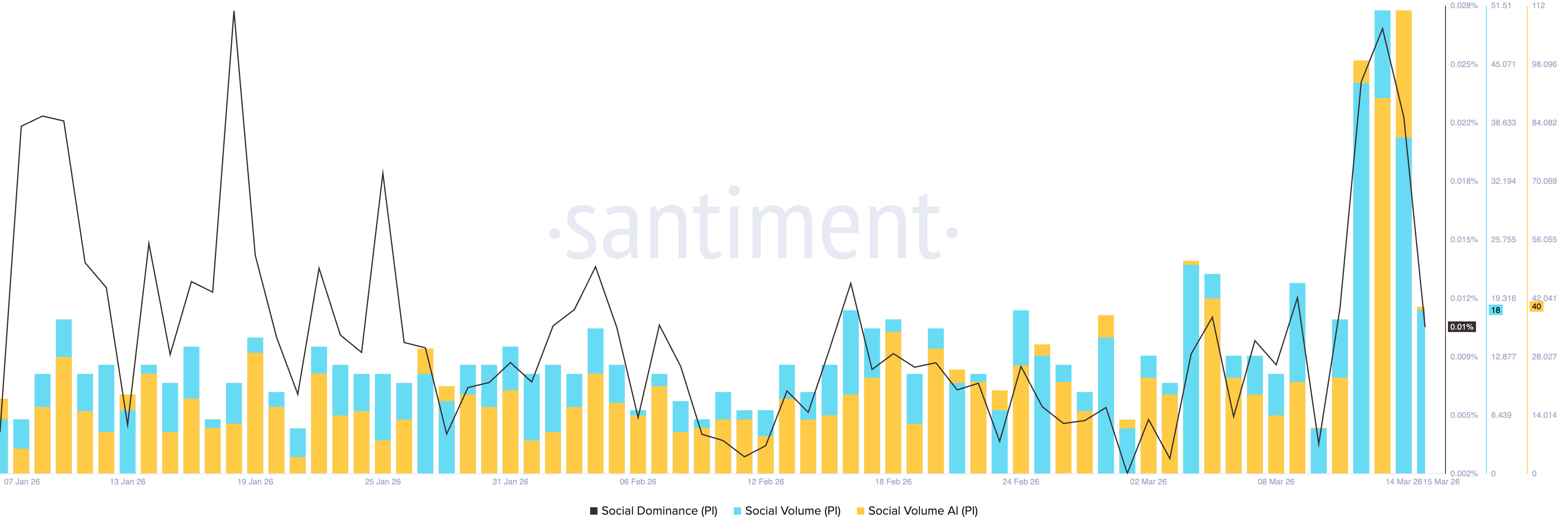 Pi Network está perdiendo demanda minorista a medida que el interés de la comunidad disminuye tras la cotización en Kraken y las celebraciones del Día de Pi. Los datos de Santiment muestran que el volumen social y la dominancia de PI cayeron a 18 publicaciones y 0.010% el domingo desde 37 y 0.021% el sábado, respectivamente. Típicamente, la fase de recuperación de Pi Network se alinea con un aumento en el ruido social, y una disminución podría señalar un potencial a la baja.