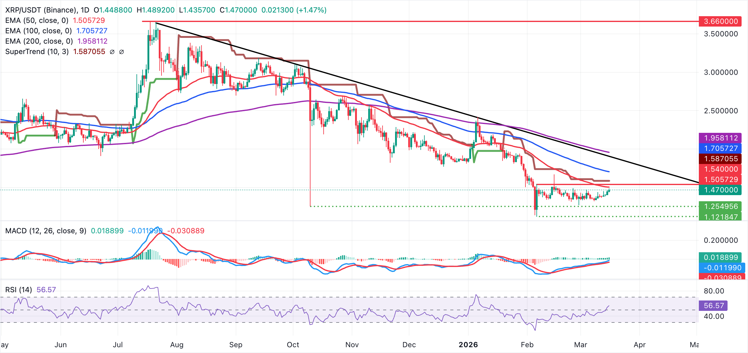 $XRP está cotizando por encima de 1.47$, con su sesgo a corto plazo manteniéndose ligeramente alcista. Las condiciones de impulso también han mejorado, con el Índice de Fuerza Relativa en 56, subiendo en el gráfico diario. Un rebote sostenido sugiere que los alcistas tienen la ventaja. El indicador de Convergencia/Divergencia de la Media Móvil (MACD) se encuentra por encima de su línea de señal en el mismo gráfico, sugiriendo solo una fase de recuperación modesta.