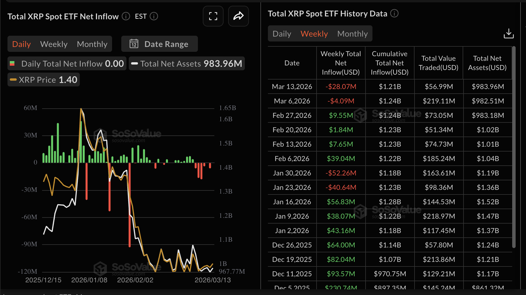 Los ETF de $XRP al contado sufrieron su segunda semana de salidas, totalizando 28 millones de dólares. Las salidas aumentaron desde 4 millones de dólares, registradas durante la semana que terminó el 6 de marzo. Las entradas acumuladas actualmente se sitúan en 1.21 mil millones de dólares, con activos netos bajo gestión en 984 millones de dólares.