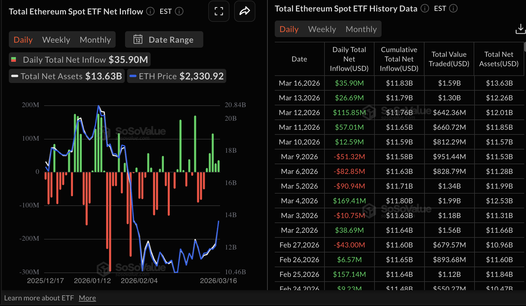Ethereum también está experimentando entradas constantes en productos de ETF al contado, apoyando el fuerte rebote desde principios de mes cuando $ETH se negociaba ligeramente por encima de 1.900$.