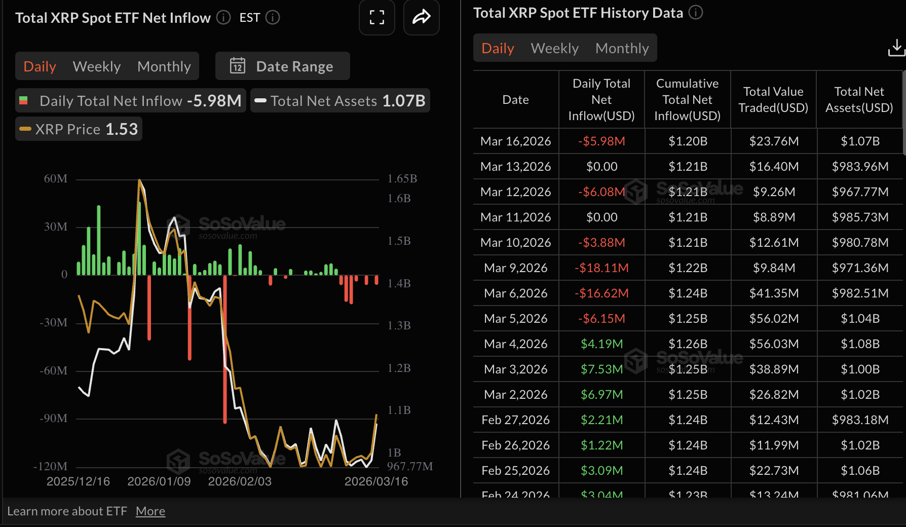 $XRP, por otro lado, parece estar rezagado en comparación con $BTC y $ETH. Los ETFs al contado vieron salidas totales de 6 millones de dólares el lunes. Mirando hacia atrás, la actividad se mantuvo apagada el viernes, con los ETF cerrando con flujos cero. Los datos de SoSoValue muestran que las entradas acumuladas actualmente promedian 1.2 mil millones de dólares, y los activos netos son 1.07 mil millones de dólares. Si las salidas persisten, es probable que limiten el potencial de recuperación de $XRP, significando el impacto de la salida de capital en el precio.