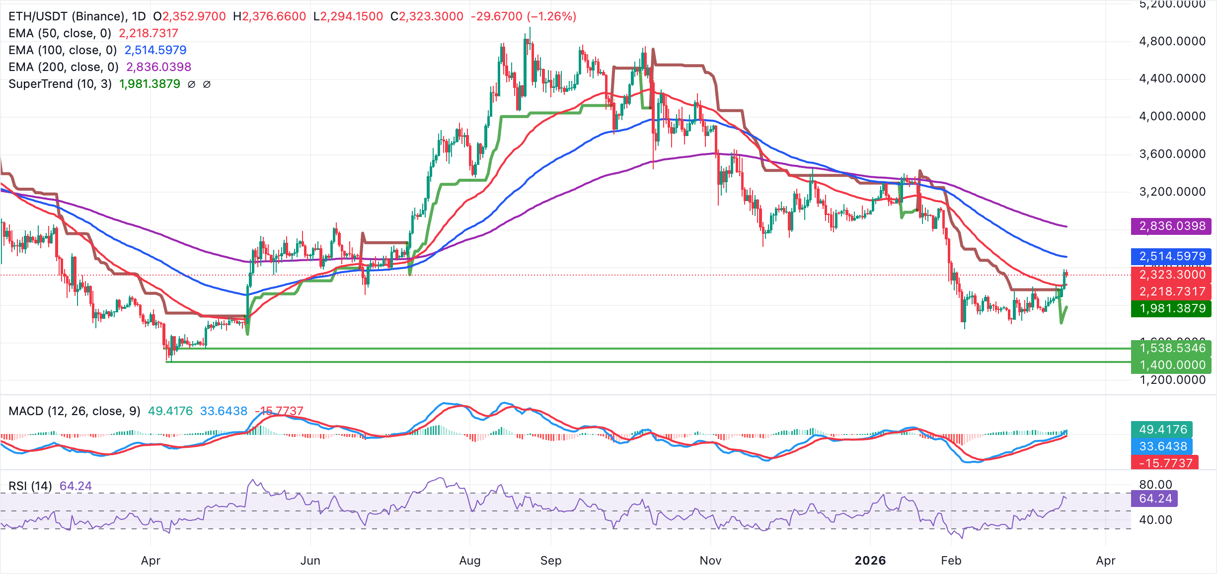 Ethereum se mantiene por encima del nivel de soporte inmediato de 2.300$, con su sesgo a corto plazo permaneciendo ligeramente alcista. La EMA de 50 días en 2.219$ refuerza la perspectiva alcista a corto plazo, mientras que el indicador SuperTrend se alinea con una zona de demanda más baja alrededor de 1.981$.