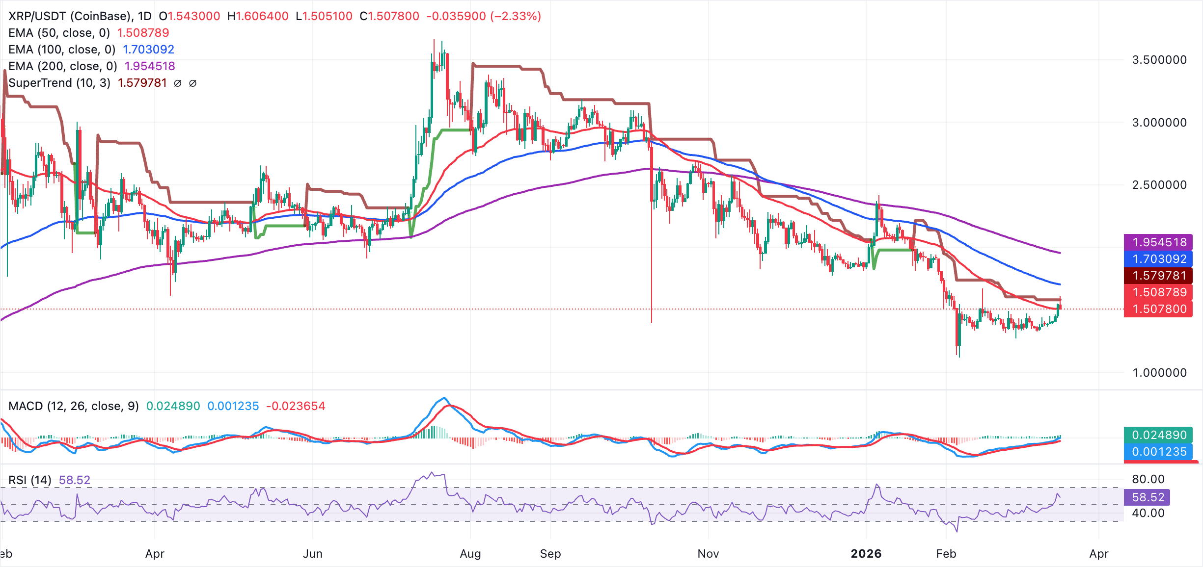Un cierre diario por encima de la EMA de 50 días, seguido de una ruptura decisiva por encima del indicador SuperTrend, abriría la puerta a ganancias que se extenderían hacia la EMA de 100 días en 1.70$. Por debajo del soporte inmediato en 1.51$, $XRP estaría expuesto a la apertura semanal en 1.45$ y al mínimo del lunes en 1.43$.
