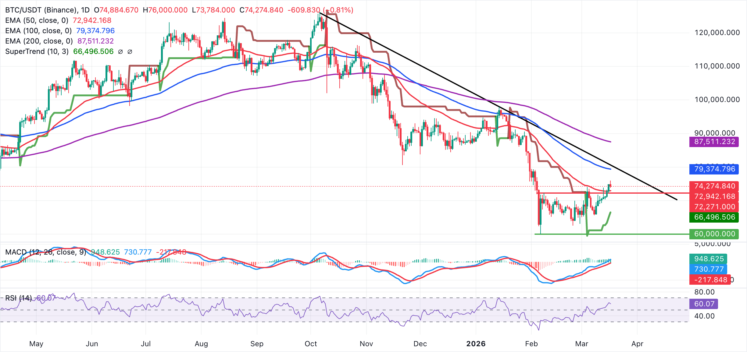 El mercado de criptomonedas se ha mantenido relativamente robusto a pesar de la guerra en curso en Oriente Medio, que ha llevado los precios del petróleo cerca de 100$. A pesar de que el Bitcoin ($BTC) se ha retirado de su máximo diario de 76.000$ para mantenerse por encima de 74.000$ en el momento de escribir, está manteniendo ganancias modestas desde el mínimo de marzo de 65.056$.