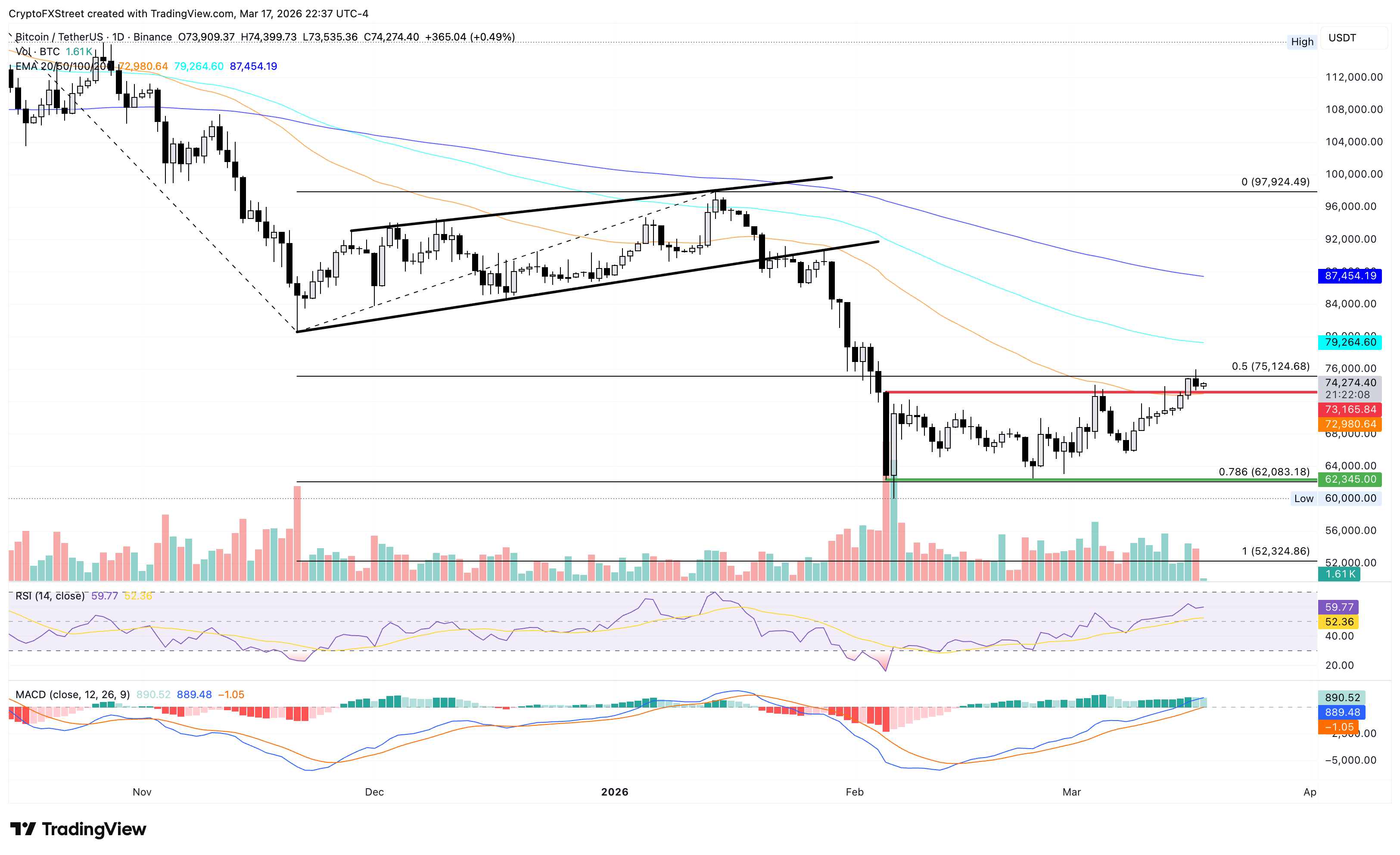 La resistencia inmediata para el Bitcoin se encuentra en el retroceso de Fibonacci del 50% basado en tendencias en 75.124 $, limitando el alza hacia la EMA de 100 días en 79.264 $.