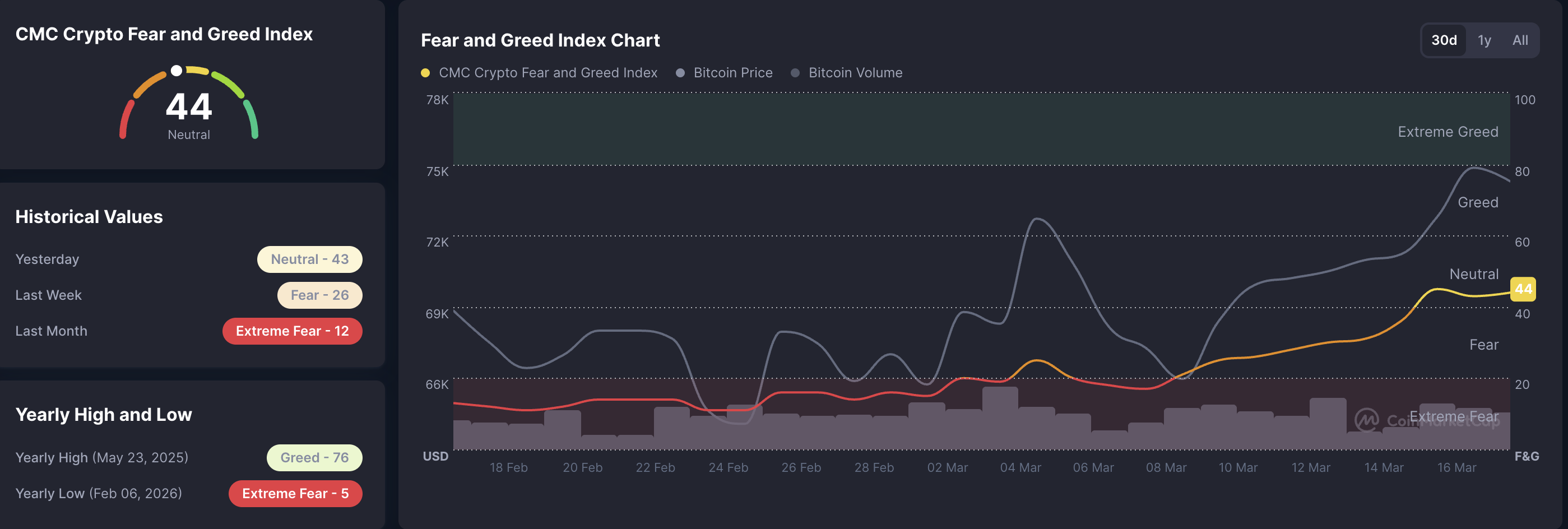 A pesar del retroceso a corto plazo en el rally de recuperación del Bitcoin, el sentimiento del mercado más amplio permanece neutral, según el Índice de Miedo y Codicia Cripto de CoinMarketCap, que se sitúa en 44. Lecturas entre 40 y 60 sugieren un sentimiento de mercado neutral, mientras que lecturas por encima de 60 reflejan codicia y por debajo de 40 indican miedo.