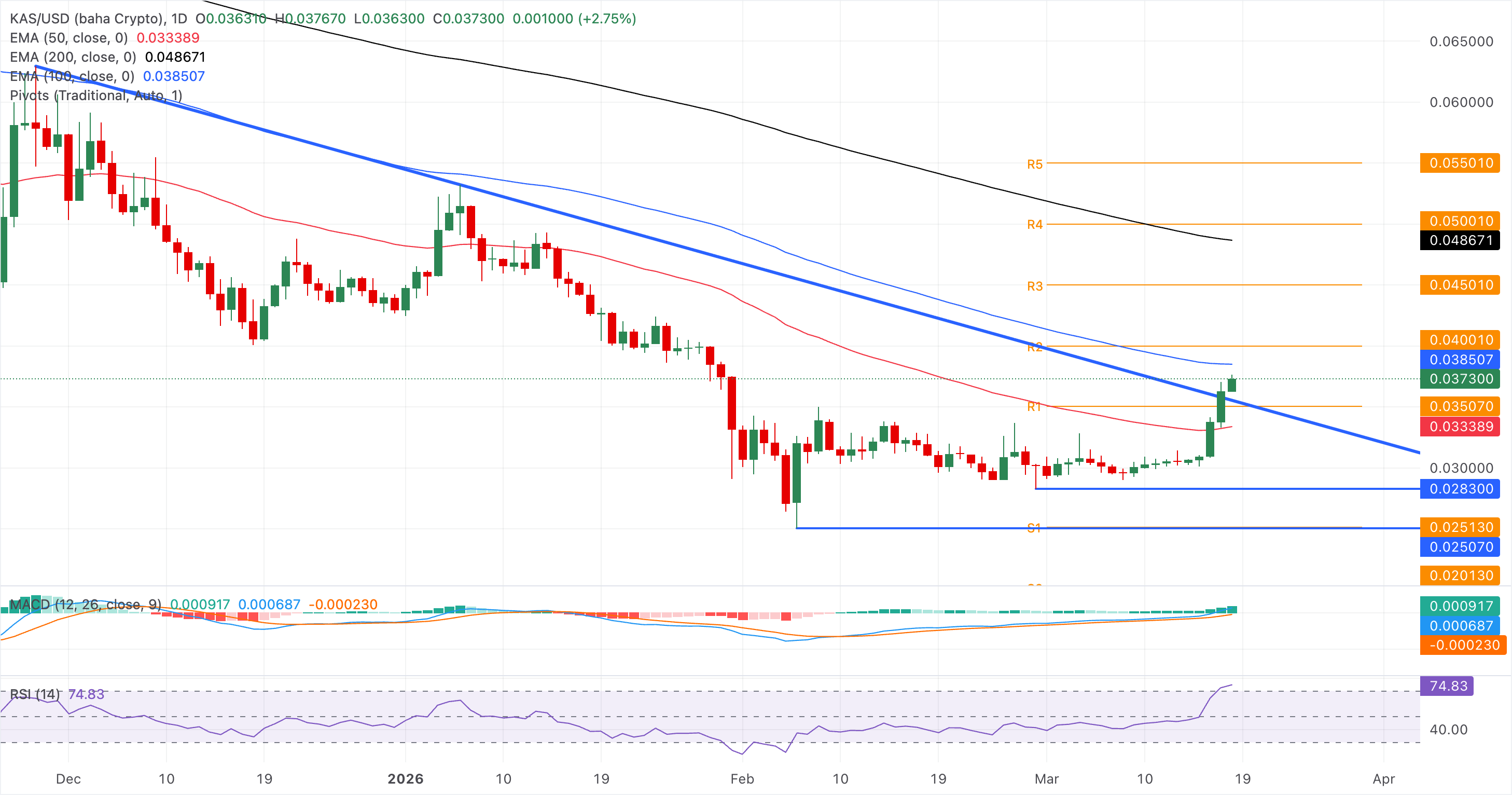 La inclinación a corto plazo es alcista ya que $KAS extiende su rally después de atravesar la línea de tendencia descendente, con la región de ruptura cerca de 0.0355 $ ahora actuando como un pivote. Sin embargo, las EMAs de 50, 100 y 200 días en descenso enmarcan el movimiento como una recuperación temprana dentro de una estructura correctiva más amplia.