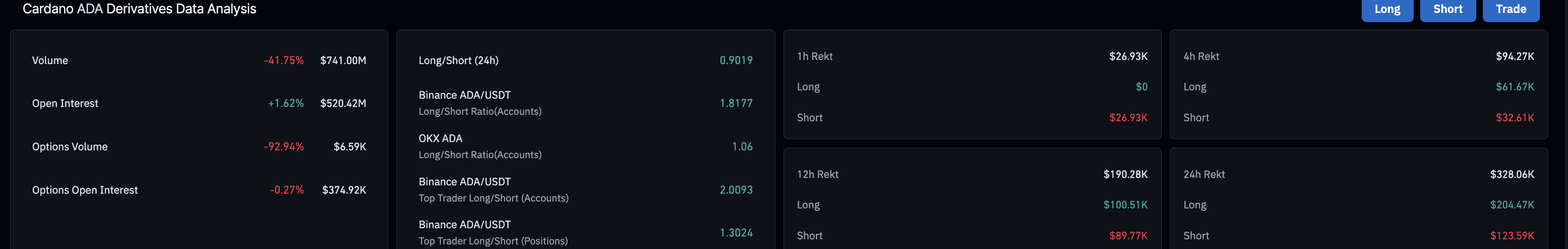 Sin embargo, las liquidaciones totales en las últimas 24 horas ascienden a 328.060 $, lideradas por liquidaciones largas de 204.470 $, reflejando un borrado posicional ampliamente alcista, lo que ha reducido la relación de largos a cortos a 0.9019. A medida que un mayor número de posiciones cortas están activas en los derivados de Cardano, la tendencia se inclina a la baja.