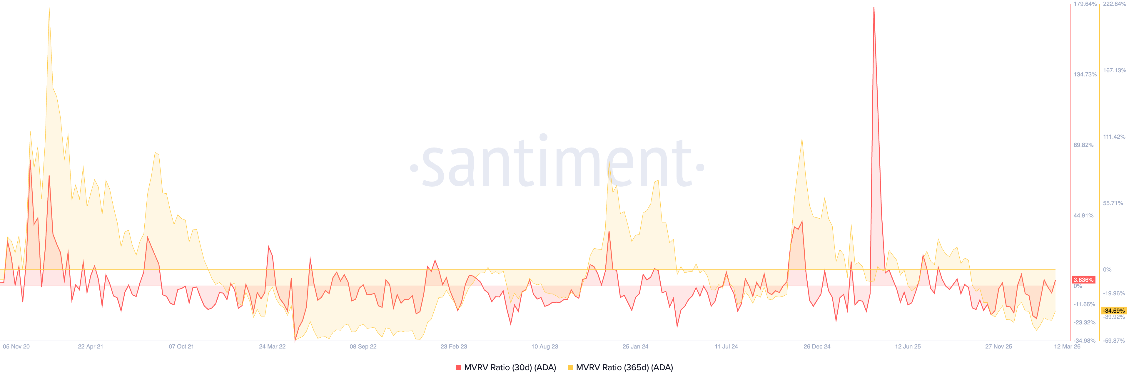 El movimiento en cadena de los tokens $ADA durante los últimos 365 días sugiere que los inversores están en pérdidas, lo que implica que Cardano está infravalorado en este momento. Los datos de Santiment muestran que la lectura del MVRV – la relación del precio de mercado al precio promedio de los tokens $ADA movidos en cadena durante los últimos 365 días – está en -34.69%, sugiriendo un potencial al alza a largo plazo para Cardano.