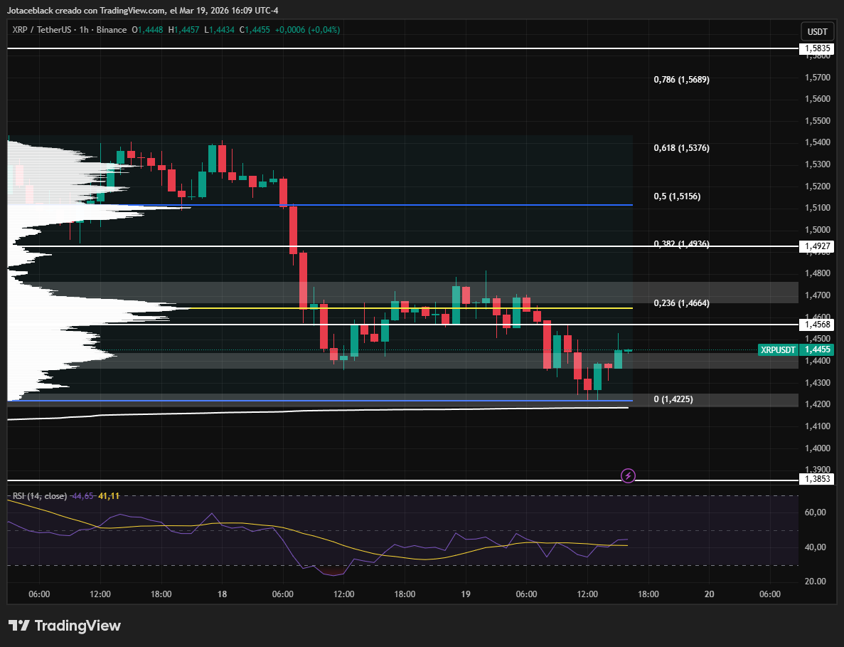 De cara al corto plazo, si el precio logra recuperar y consolidarse por encima de los $1,46, el siguiente objetivo se ubicaría en torno a los $1,49, con extensión potencial hacia los $1,51. En cambio, si $XRP no logra sostener la estructura alcista y pierde la zona de $1,44–$1,45, aumentan las probabilidades de una continuación bajista hacia los $1,42–$1,38, nivel que volvería a actuar como soporte relevante.