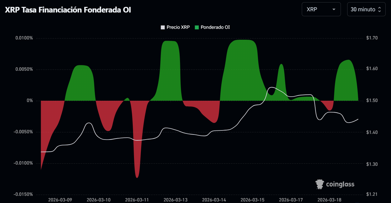 En el tramo más reciente del gráfico de funding rates de $XRP, se observa un comportamiento alineado entre el precio y el posicionamiento del mercado. Durante el 18 de marzo, el funding rate pasó a territorio positivo, coincidiendo con un impulso alcista en el precio, lo que indica que los traders comenzaron a pagar por mantener posiciones largas abiertas.
